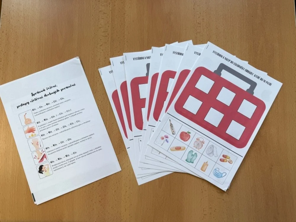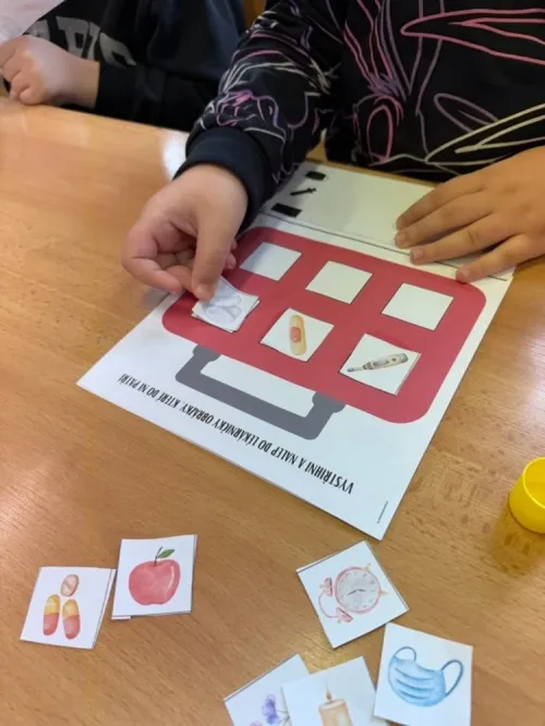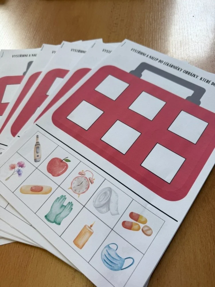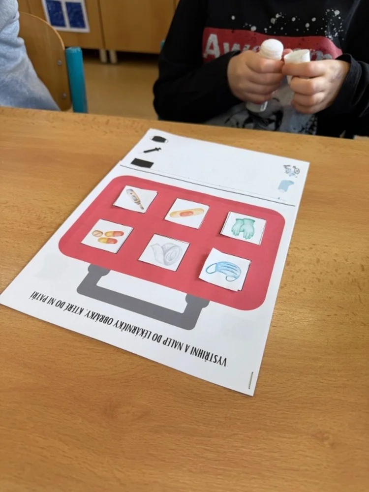 Poté si žáci své znalosti procvičili v pracovním listu a také si vyzkoušeli, co patří do lékárničky – obrázky vystřihovali a správně nalepovali. Hodina byla pro všechny velmi přínosná, děti pracovala se zájmem a celou výuku si moc užily.