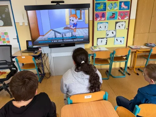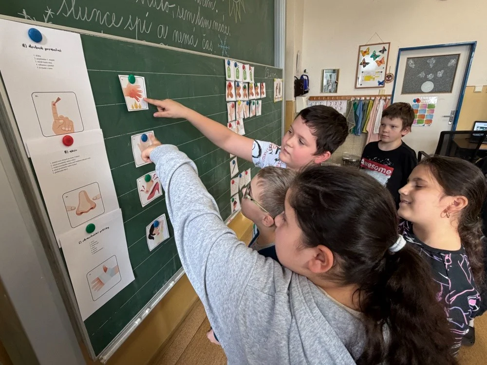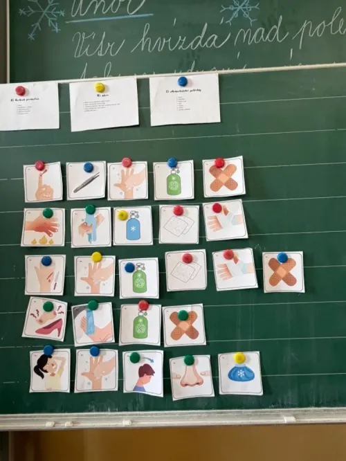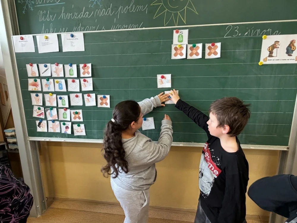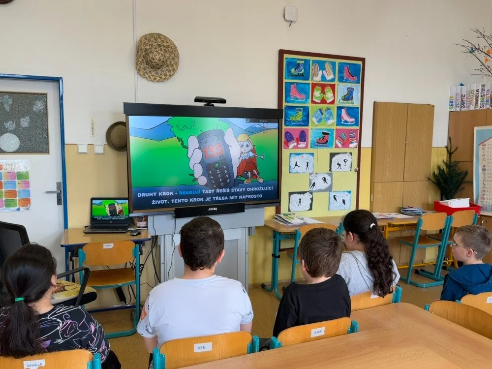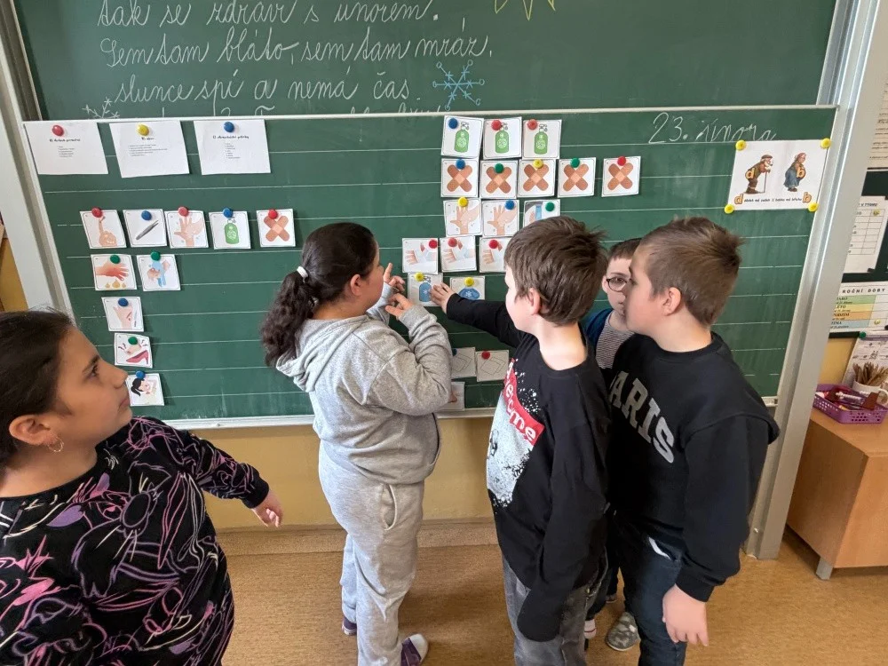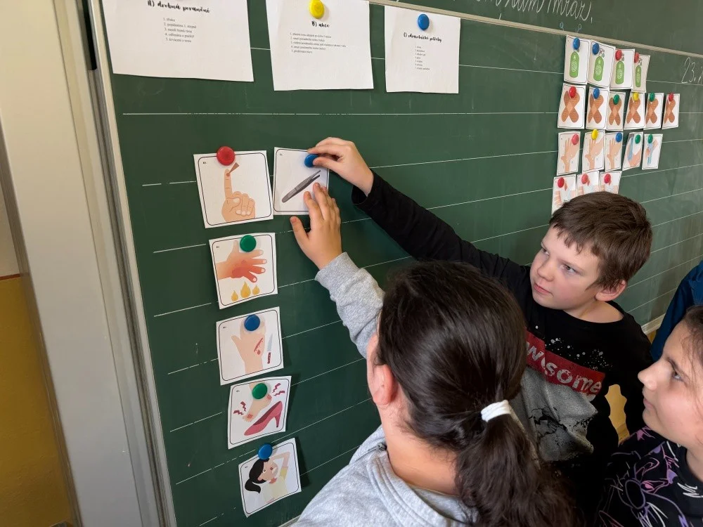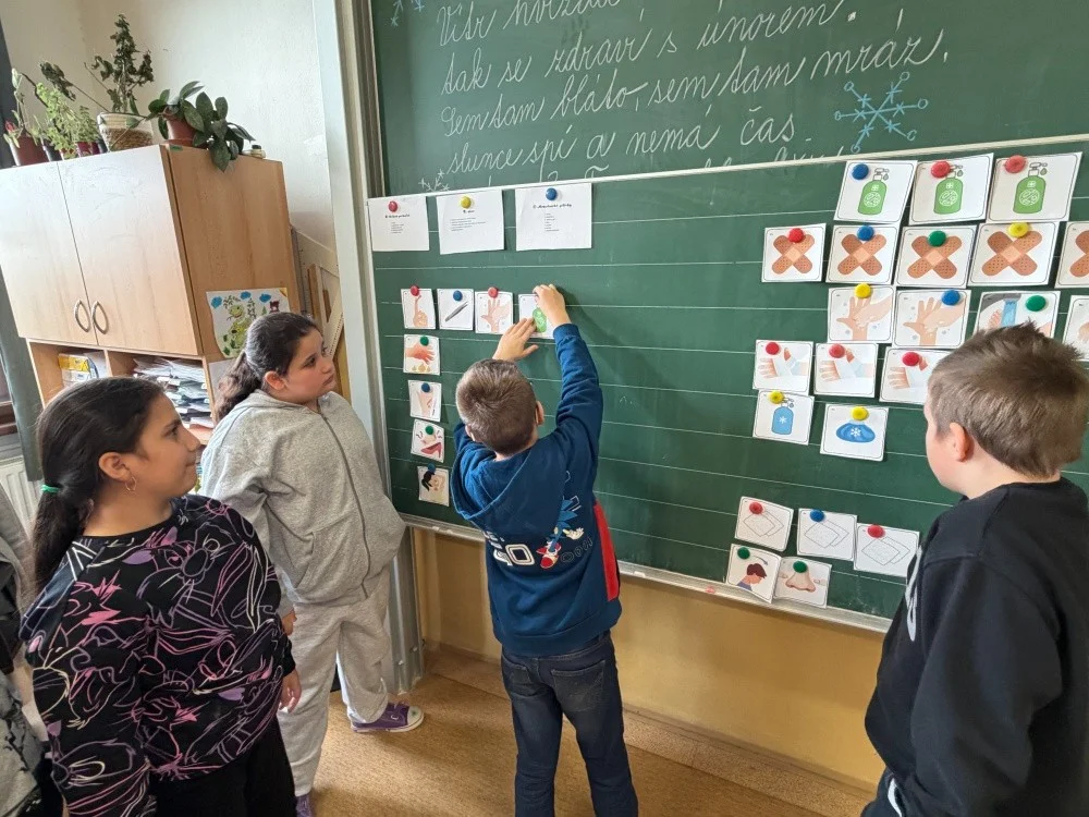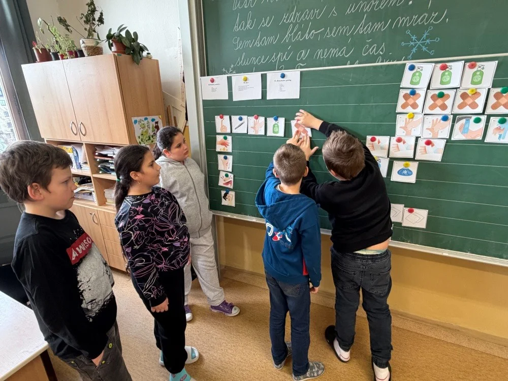 V hodině prvouky se žáci III. třídy věnovali důležitému tématu první pomoci. Nejprve zhlédli výuková videa, která jim přiblížila základní postupy při ošetřování různých zranění. Následně na tabuli přiřazovali obrázky k jednotlivým situacím a společně si vysvětlovali, co je potřeba udělat – například dezinfekci rukou a rány, správné obvázání, použití pinzety při vytahování třísky nebo jak ošetřit popáleniny.