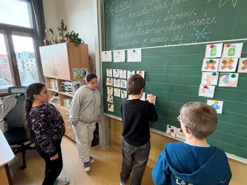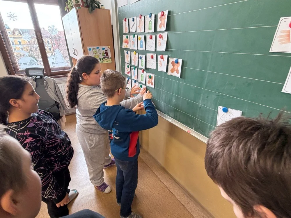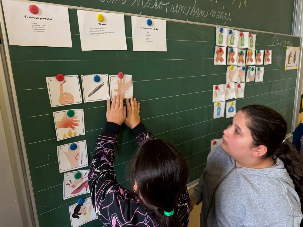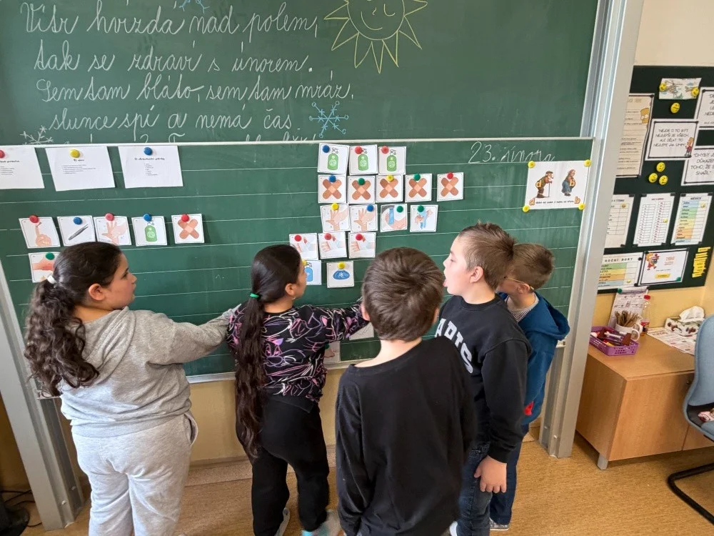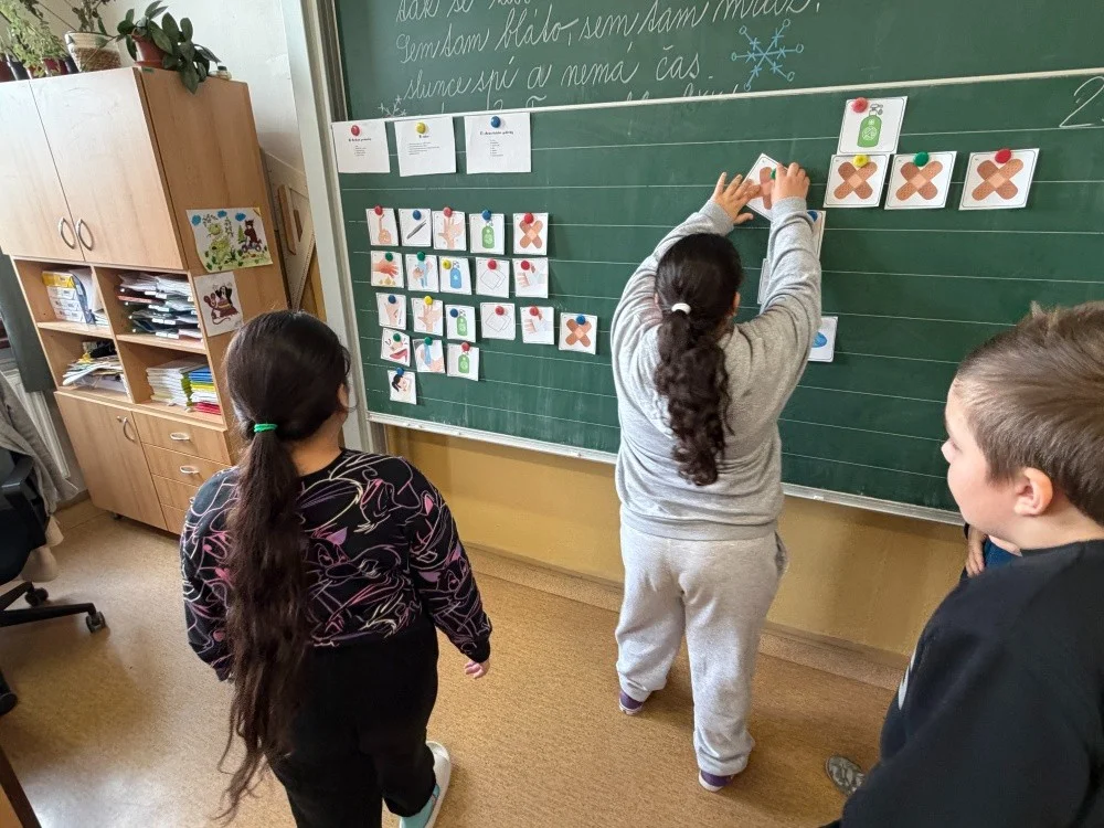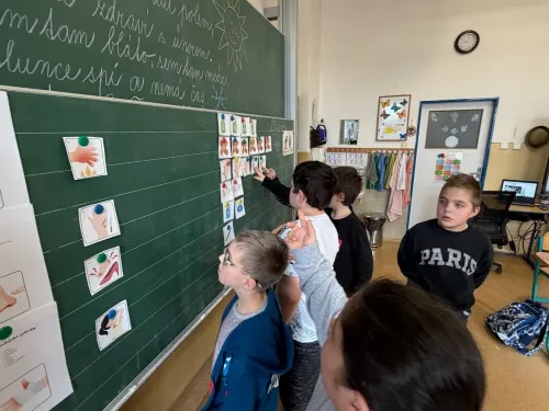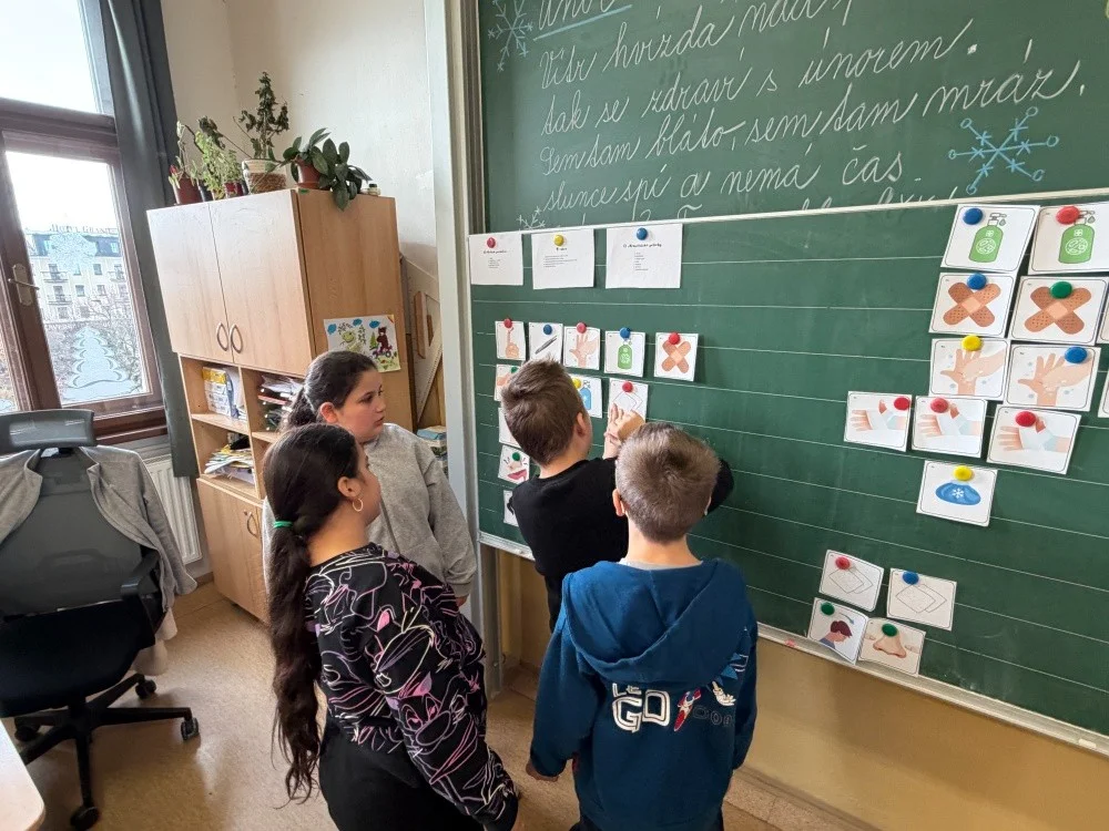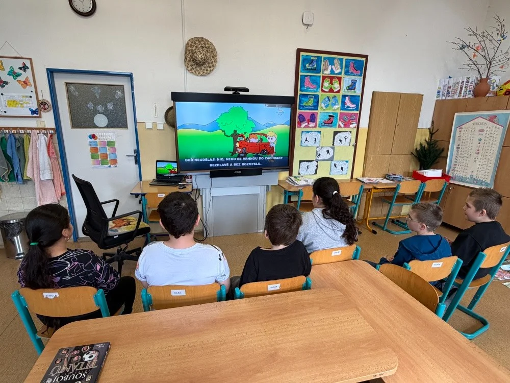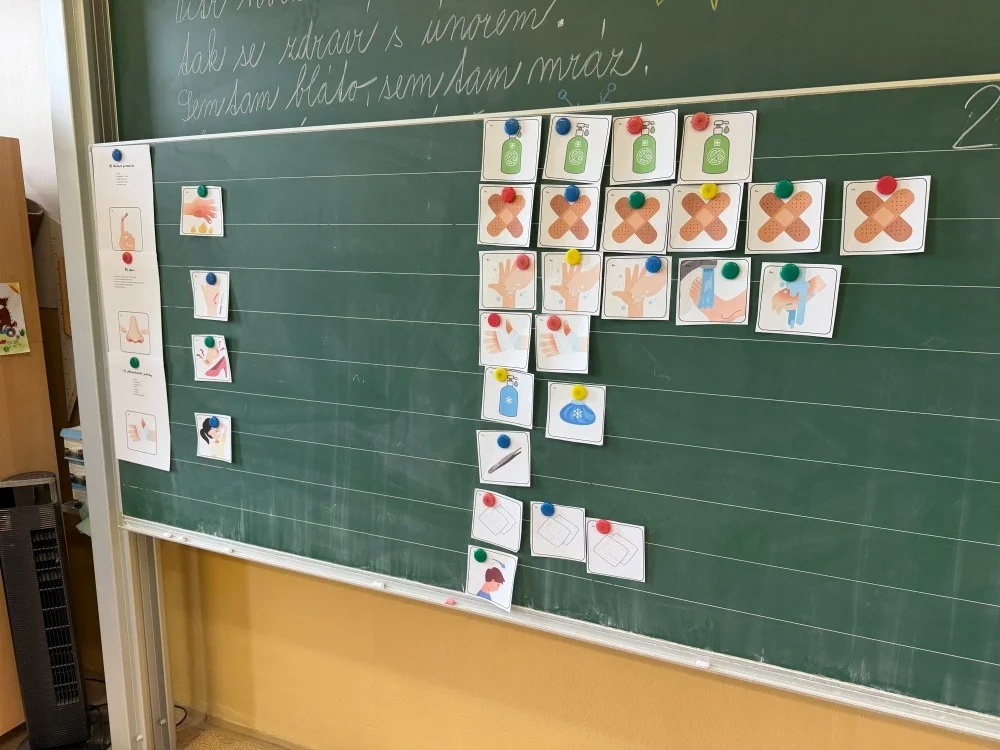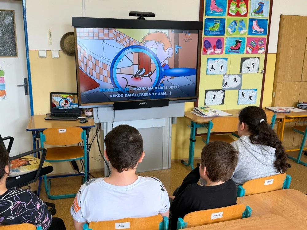 V hodině prvouky se žáci III. třídy věnovali důležitému tématu první pomoci. Nejprve zhlédli výuková videa, která jim přiblížila základní postupy při ošetřování různých zranění. Následně na tabuli přiřazovali obrázky k jednotlivým situacím a společně si vysvětlovali, co je potřeba udělat – například dezinfekci rukou a rány, správné obvázání, použití pinzety při vytahování třísky nebo jak ošetřit popáleniny.
