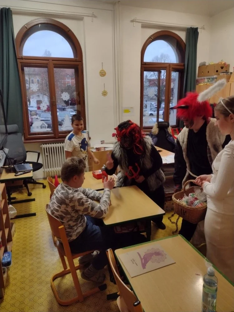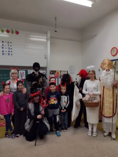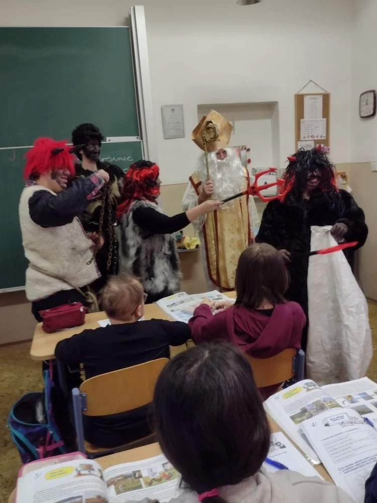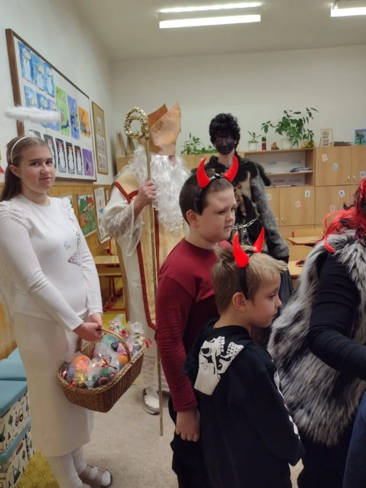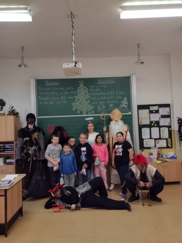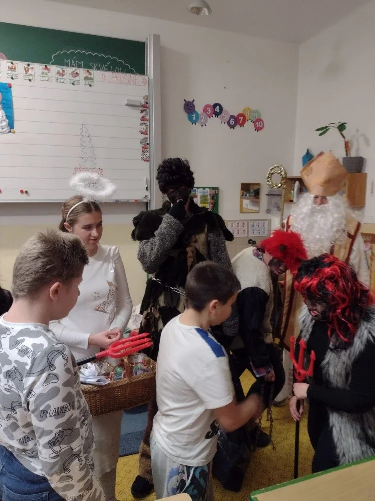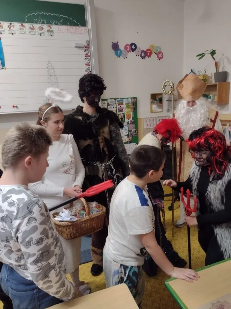 V pátek 5. 12. prošla mikulášská družina i naší školou. Mikuláš, krásný anděl a Lucifer se svými třemi pomocníky navštívili každou třídu. Družina domlouvala hříšníkům, vyslechla si básničky, zazpívala písničky a letos si i zatancovala. Děti obdržely balíčky a na chuť perníček. Všichni se dobře bavili.
