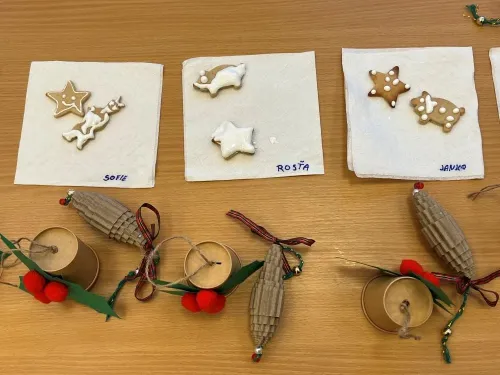 Žáci si vyrobili dekorace k zavěšení na stromeček – zvoneček a šišku, ozdobili si perníčky, podívali se na práci řezbáře a výrobu ozdob na stromeček ze slámy a z kukuřičného šustí.