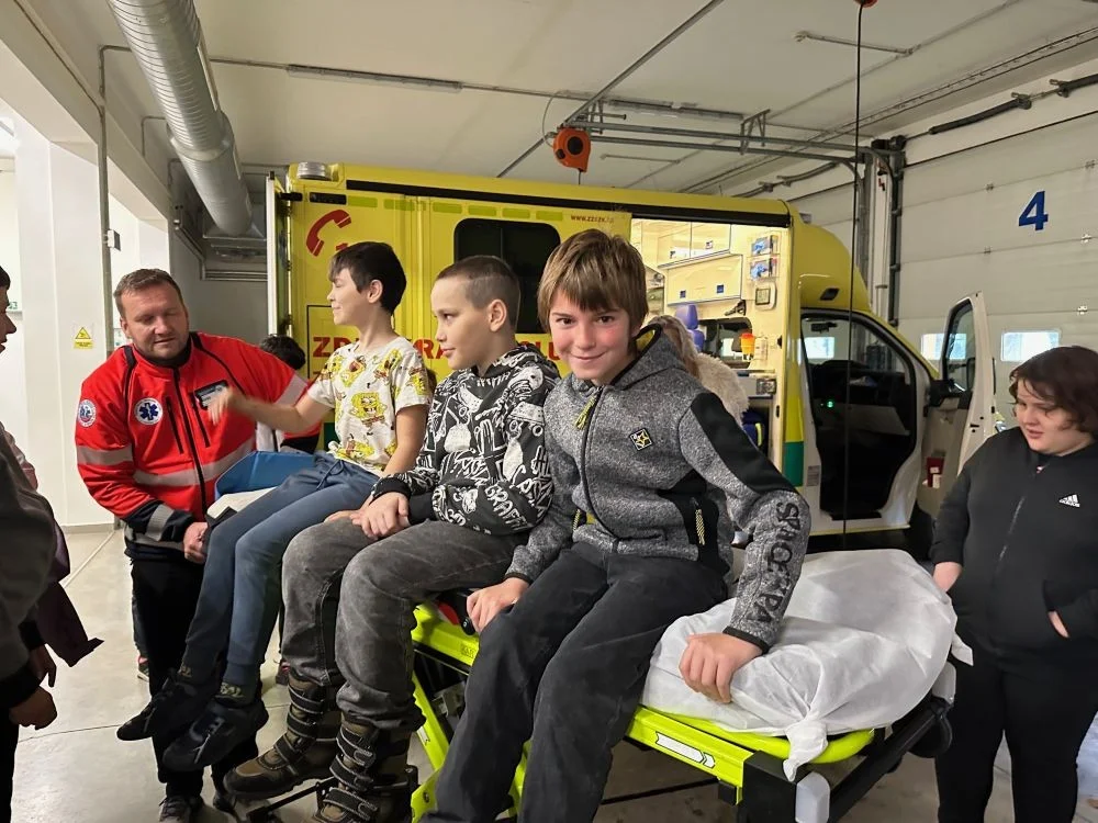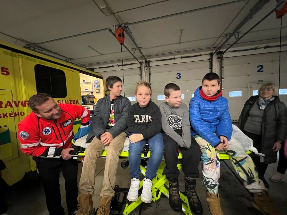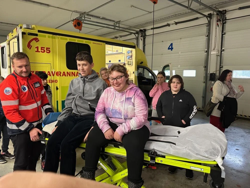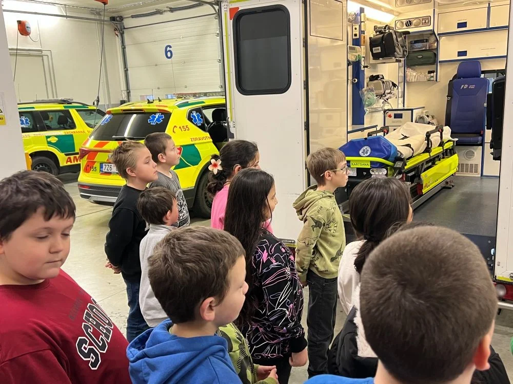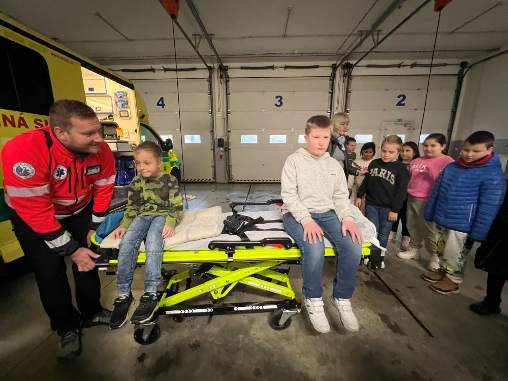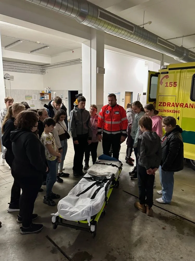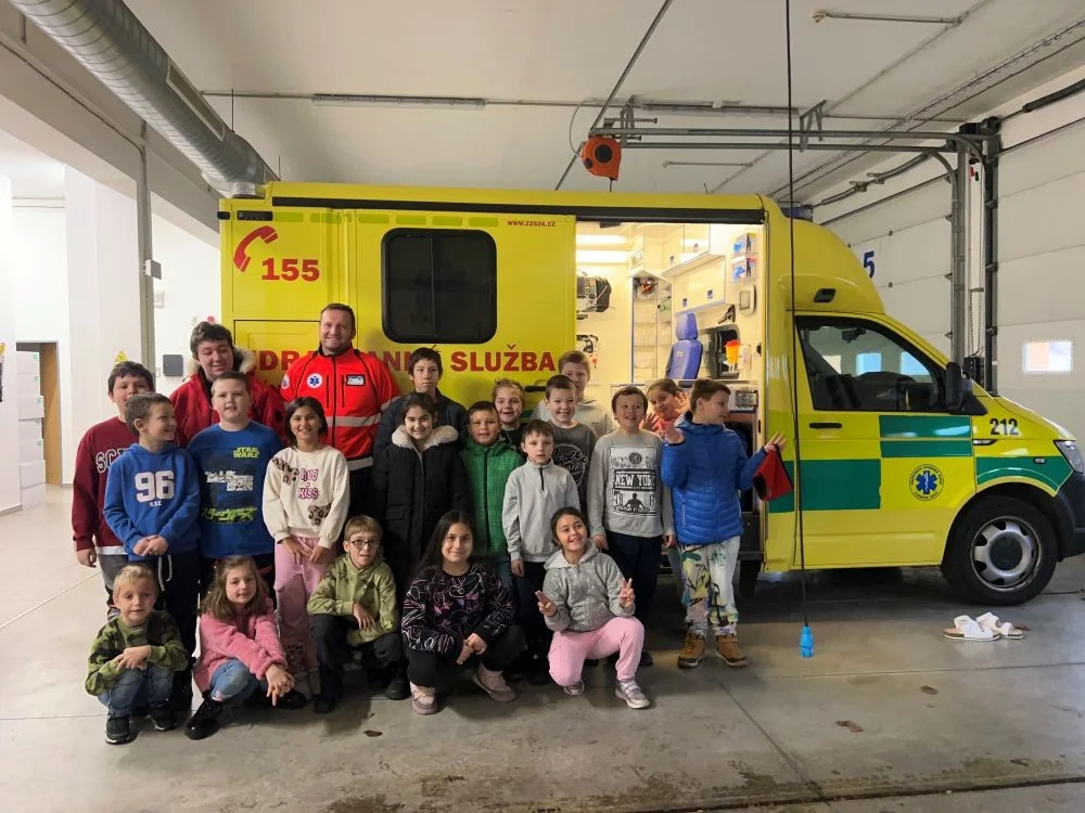 Navštívili jsme Zdravotnickou záchrannou službu při nemocnici v Uherském Hradišti. Pan záchranář nám ukázal sanitku i její vybavení a vysvětlil, jak probíhá jejich práce v terénu. Děti si mohly některé pomůcky vyzkoušet a nahlédnout do skutečného provozu záchranné služby. Exkurze byla pro všechny velmi zajímavá a poučná.