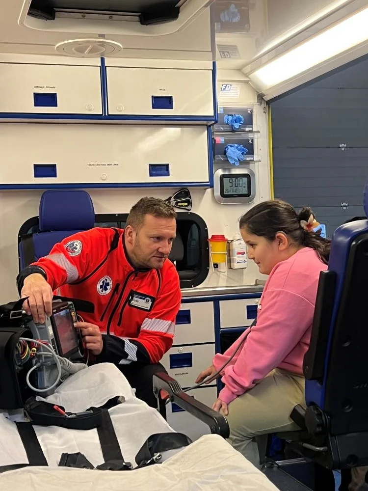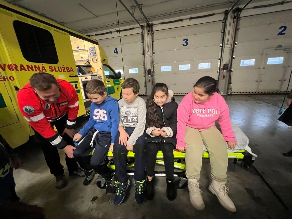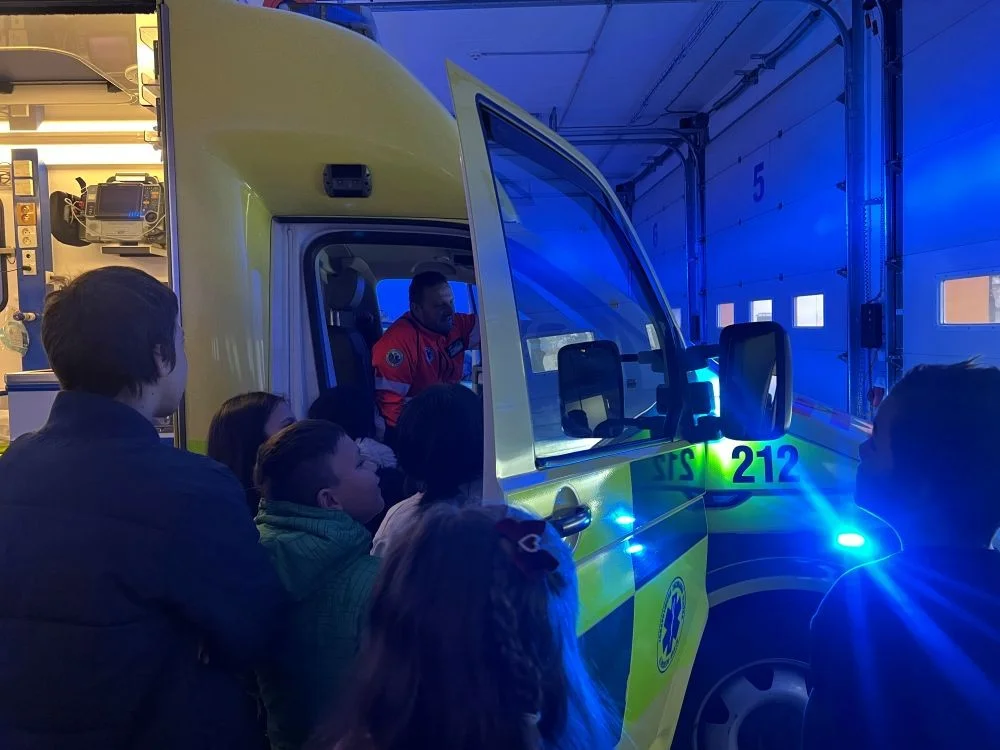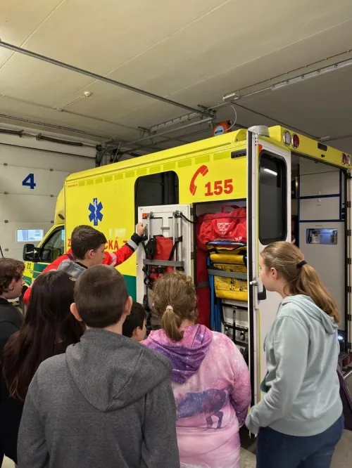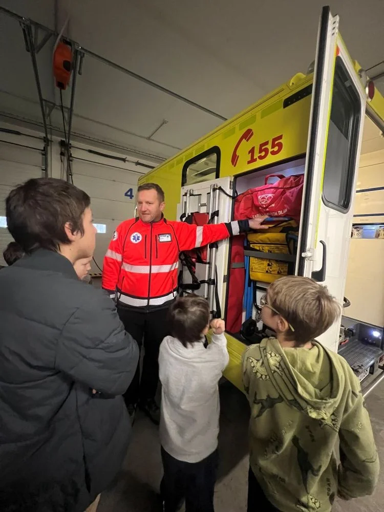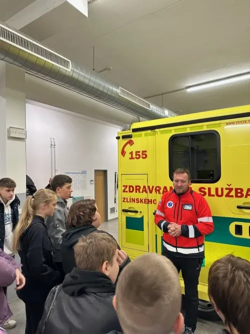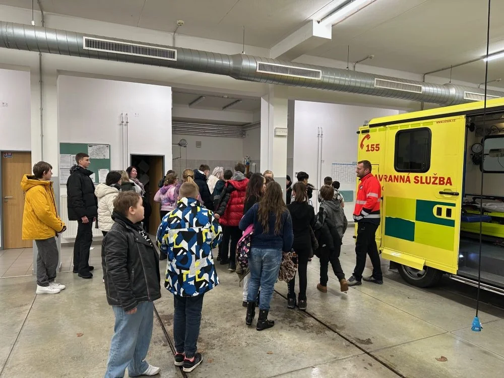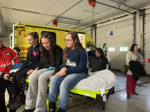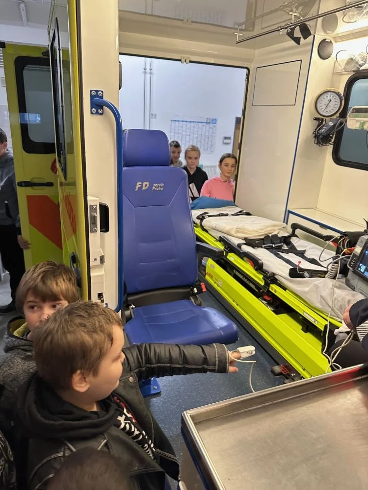 Navštívili jsme Zdravotnickou záchrannou službu při nemocnici v Uherském Hradišti. Pan záchranář nám ukázal sanitku i její vybavení a vysvětlil, jak probíhá jejich práce v terénu. Děti si mohly některé pomůcky vyzkoušet a nahlédnout do skutečného provozu záchranné služby. Exkurze byla pro všechny velmi zajímavá a poučná.